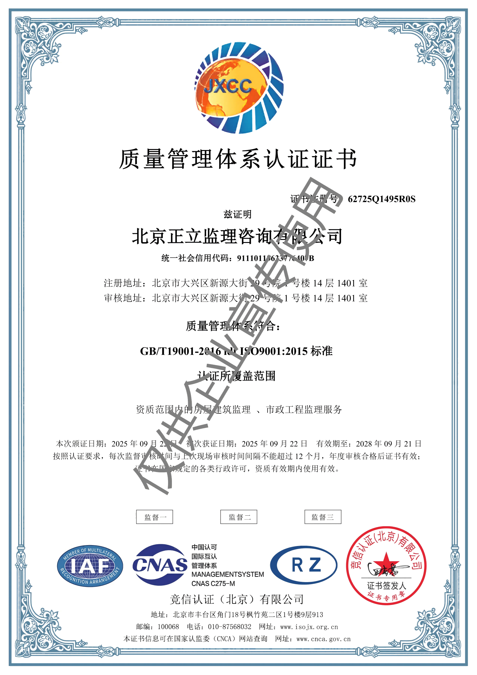 北京正立監(jiān)理咨詢有限公司成立于1998年7月1日,其前身隸屬于北京市公路質(zhì)量監(jiān)理站。具有獨(dú)立法人資格,是獨(dú)立核算、自負(fù)盈虧的經(jīng)濟(jì)實(shí)體。企業(yè)經(jīng)營(yíng)范圍:公路工程監(jiān)理、交通工程監(jiān)理、市政公用工程建設(shè)監(jiān)理、工業(yè)與民用建筑工程監(jiān)理、工程監(jiān)理咨詢、技術(shù)咨詢、技術(shù)培訓(xùn)等。